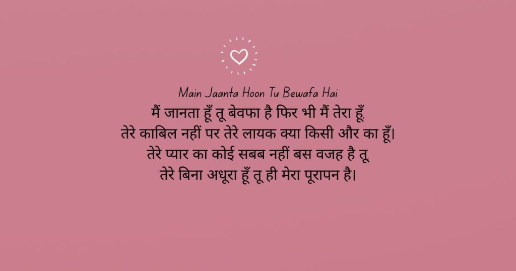 A: They are in simple Hindi with emotional Urdu words like “bewafa”, “sukoon”, “sitam” for depth.