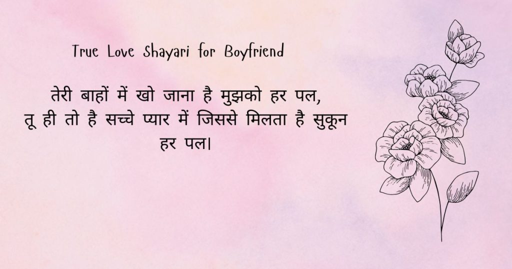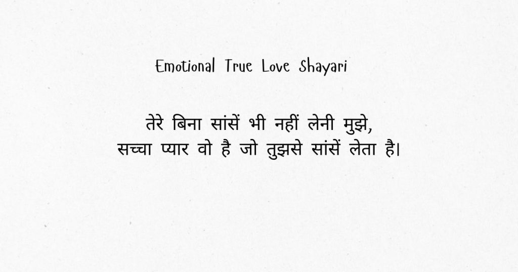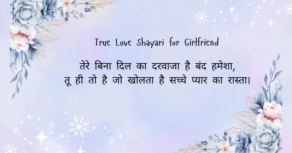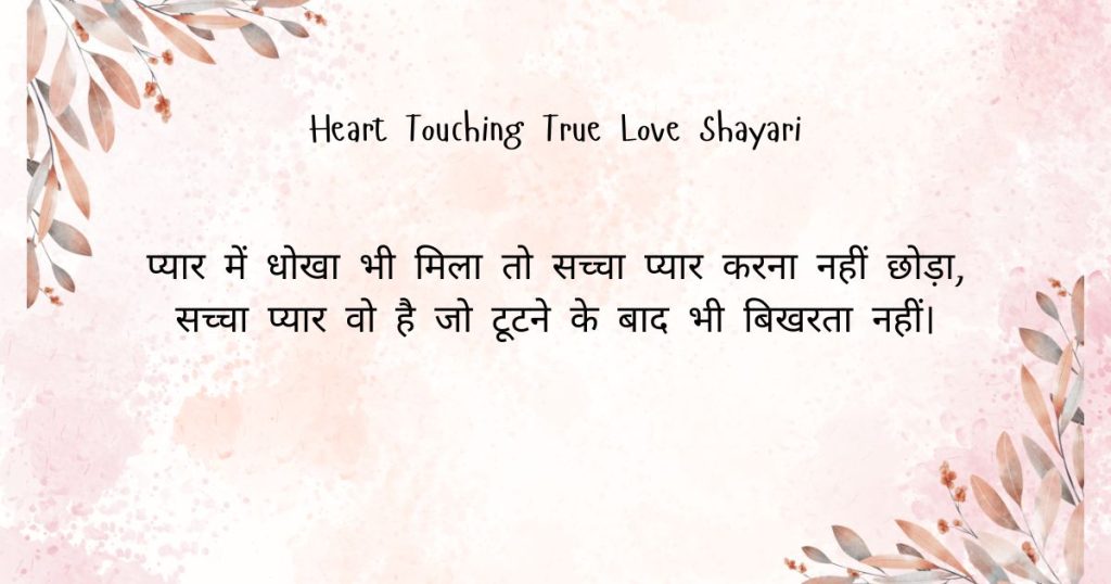 True Love Shayari in Hindi सच्चे प्यार की गहराई और खूबसूरती को शब्द देने का सबसे बेहतरीन तरीका है। इस article में हमने आपके लिए best, heart touching, girlfriend, boyfriend, two line और emotional true love shayari सहित कई श्रेणियों में बेहतरीन shayari तैयार की है। सच्चा प्यार दिखावा नहीं होता यह दिल की गहराइयों से जुड़ा होता है और ये shayari उसी एहसास को express करने में मदद करती हैं। उम्मीद है कि ये True Love Shayari in Hindi आपको पसंद आएगी और आप इसे अपने सच्चे प्यार को जताने के लिए जरूर इस्तेमाल करेंगे।